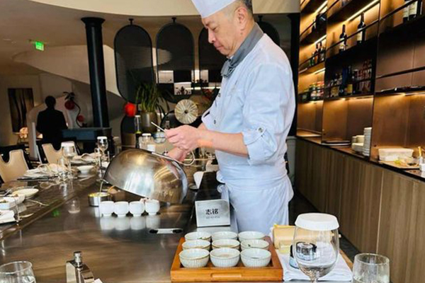 暖黃色的燈光溫柔灑落,木質(zhì)裝修散發(fā)著質(zhì)樸又溫馨的氣息。開(kāi)放式鐵板燒區(qū)熱鬧非凡,大廚在鐵板前盡情炫技,動(dòng)作行云流水。食材在鐵板上滋滋作響,肉香、菜香瞬間彌漫整個(gè)空間,勾得人直咽口水。