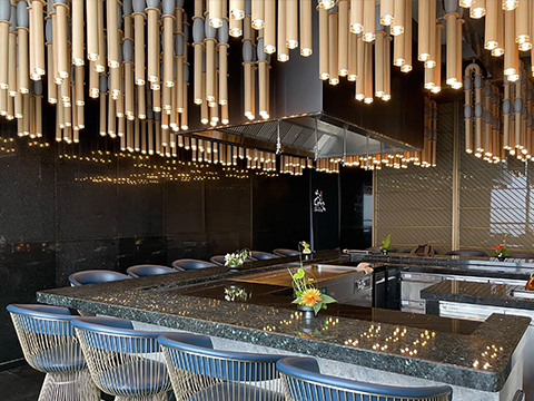 銀座小野寺長沙店位于建鴻達JW萬豪酒店35樓,置身于高空之中,獨家視野俯瞰整個長沙,高級暗黑風的裝修風格。